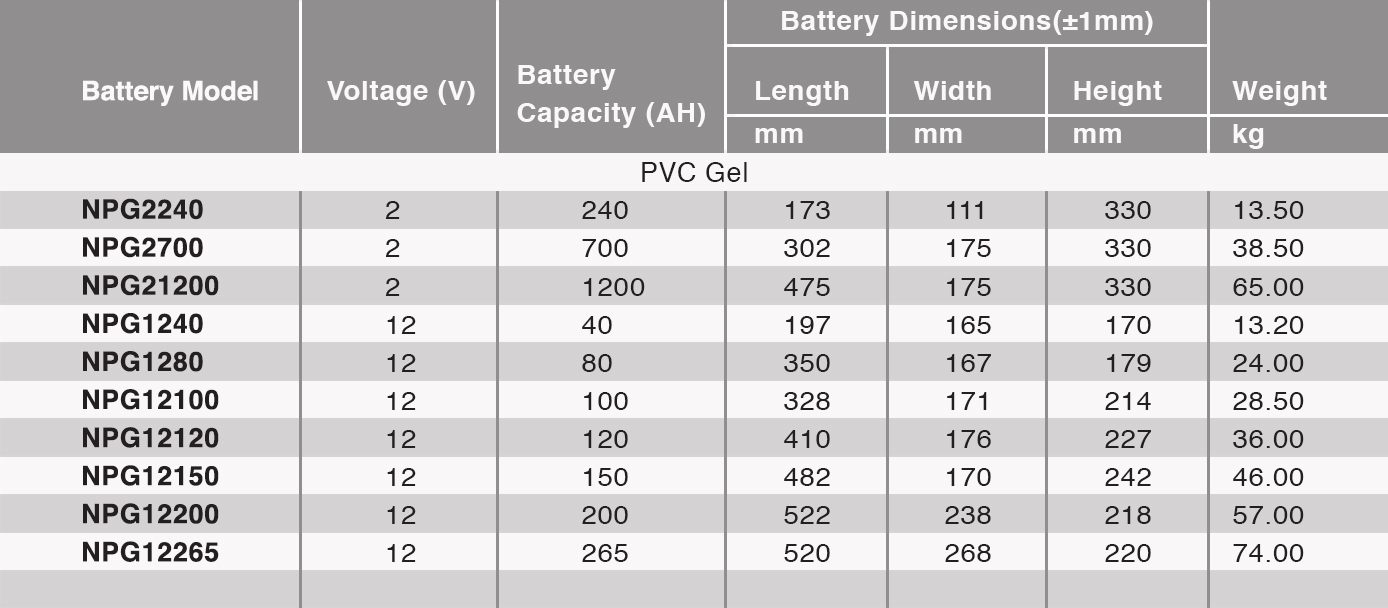 Nollon PVC GEL Series is manufactured with PVC/SiO2 separator and fumed Silica. Gel battery is featured with low self-discharge, strong ability to recover from deep discharging, it has long service life and 50% more deep cycle life and excellent performance at cold ambient temperatures than conventional VRLA.